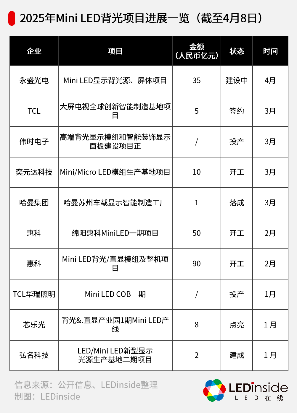 4月4日,靖江发布消息,永盛光电Mini LED显示背光源、屏体项目正在进行主体工程建设,预计2025年6月主体封顶,并在2026年一季度实现量产。
