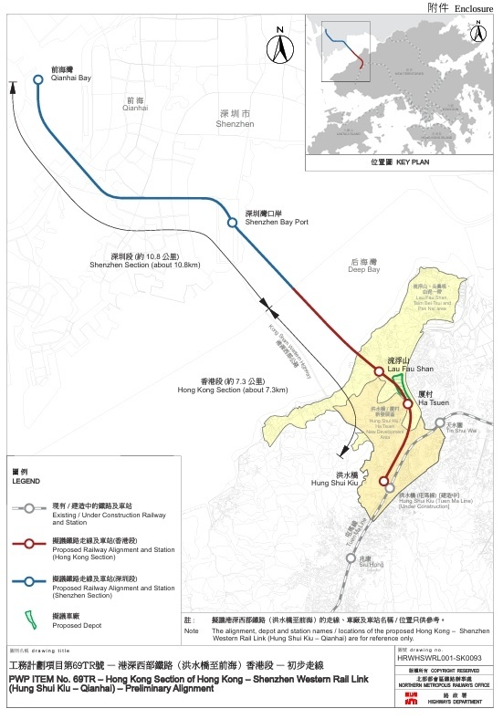 文件显示,港深西部铁路全长约18.1公里,香港段及深圳段分别为约7.3公里及10.8公里,走线由正在兴建的屯马线洪水桥站西面出发,途经厦村和流浮山,在穿越后海湾海底后,经深圳湾口岸连接至前海。