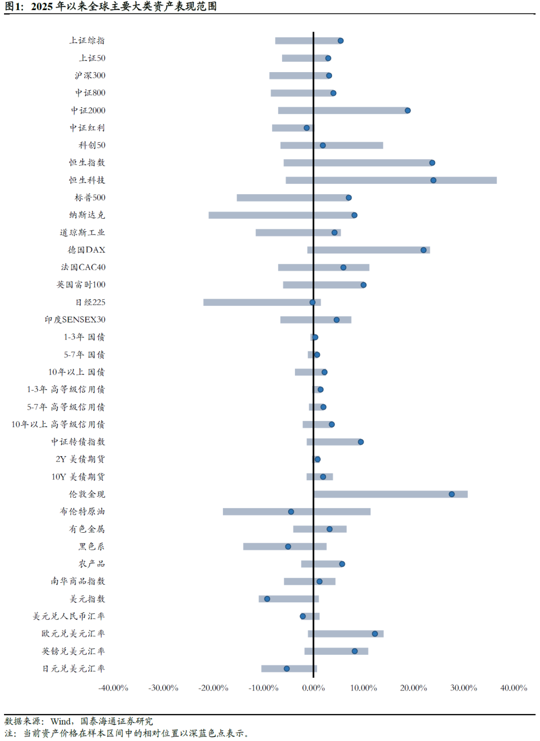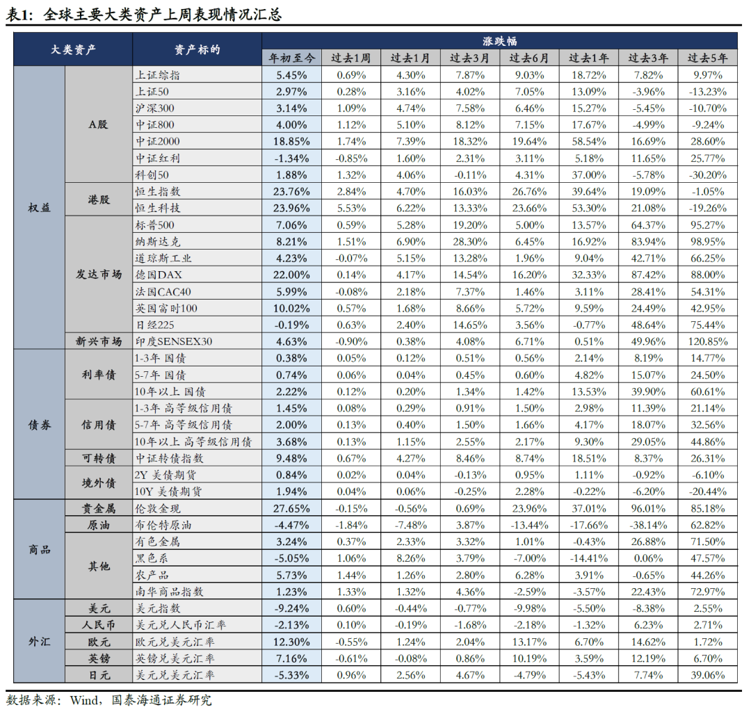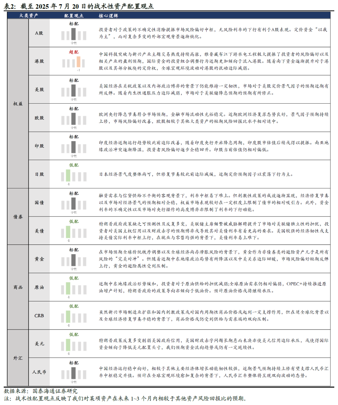 投资要点 ]article_adlist-->▶近期大类资产定价主要受市场风险偏好改善主导,风险资产显著优于避险资产,权益≥商品>债券。市场担忧鲍威尔被解聘或破坏投资者对美联储货币政策指引的信心,雅鲁藏布江下游水电工程极大提振了投资者的风险偏好,而日本执政联盟失去参院多数议席或削弱政策可预测性。我们仍维持此前的战术性大类资产配置观点。权益资产中,我们对分子端景气预期持续上修、市场流动性与风险偏好逐渐改善的港股相对乐观,对基本面预期震荡下修、通胀压力较大以及政策可预测性削弱的日股相对谨慎。债券资产中,我们对受到财政压力以及较强经济内生性动力压制的美债相对谨慎。大宗商品中,我们认为商品价格或仍受到供给与需求端的双向压制。全球外汇中,我们认为中国经济运行趋势稳中向好、相较于其他主要经济体增长动能韧性较强有望支撑人民币汇率中枢稳定。